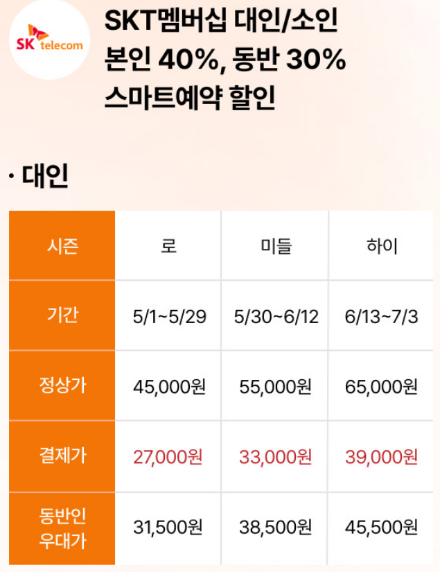 SKT 멤버십 (온라인 예매) 본인 40%, 동반 30% 할인